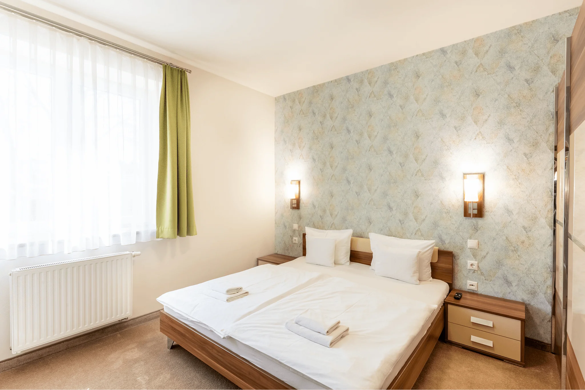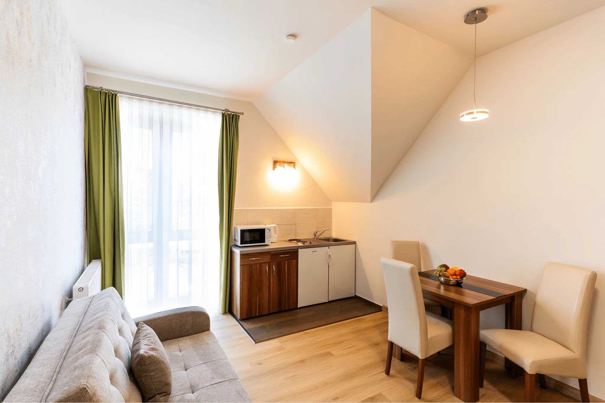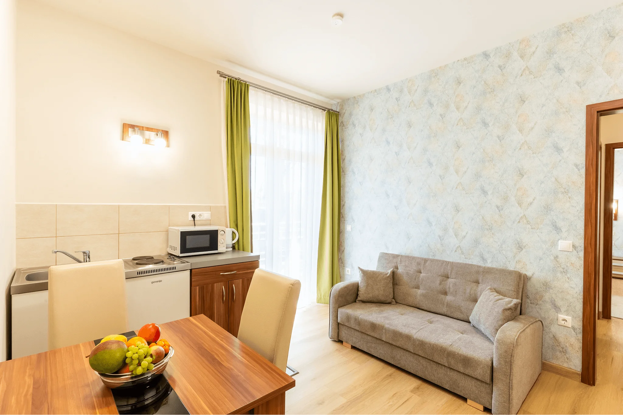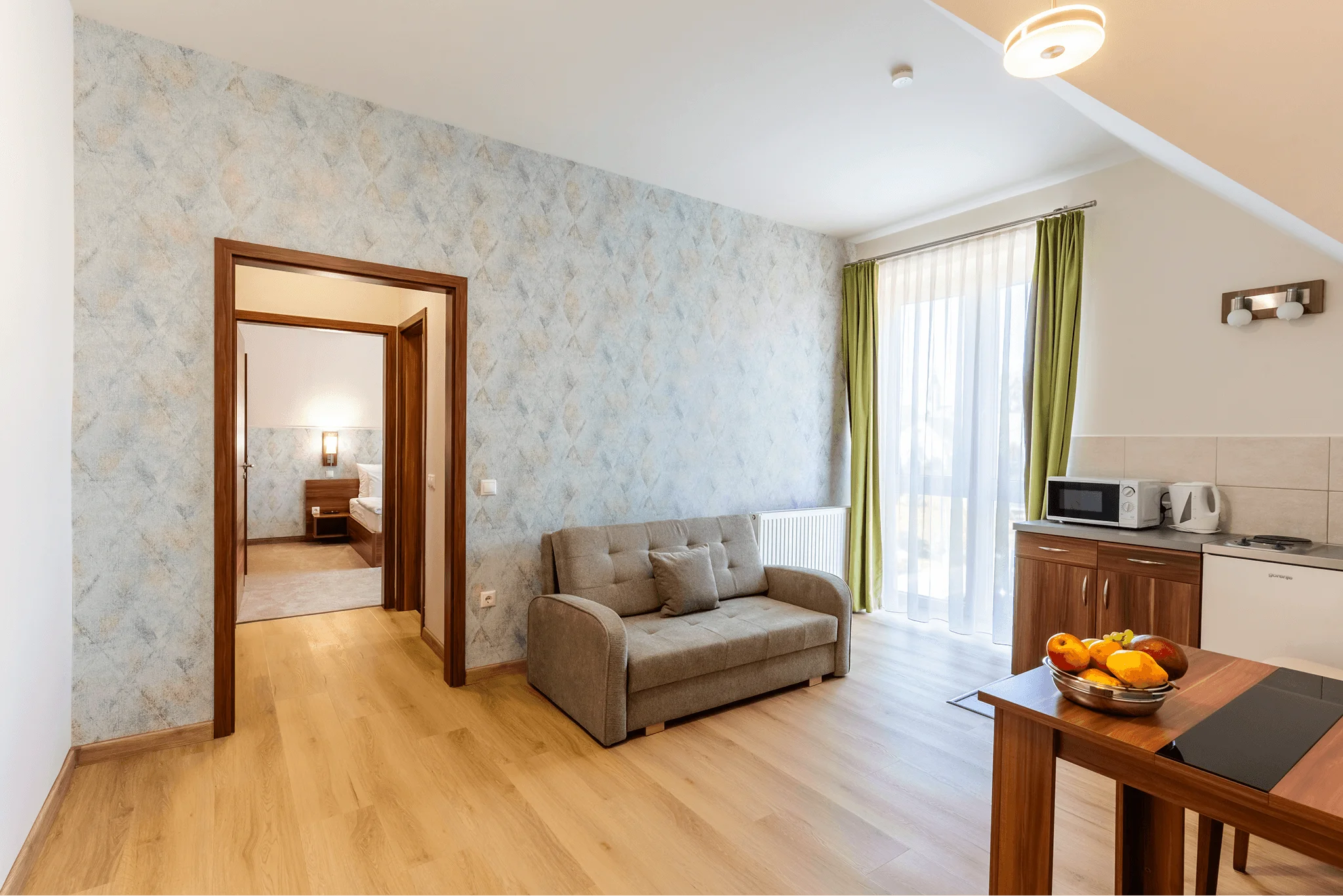 Apartments with a separate living room and bedroom. There is a double bed in the bedroom and a pull-out sofa in the living room. Ideal for groups of friends up to 4 people.