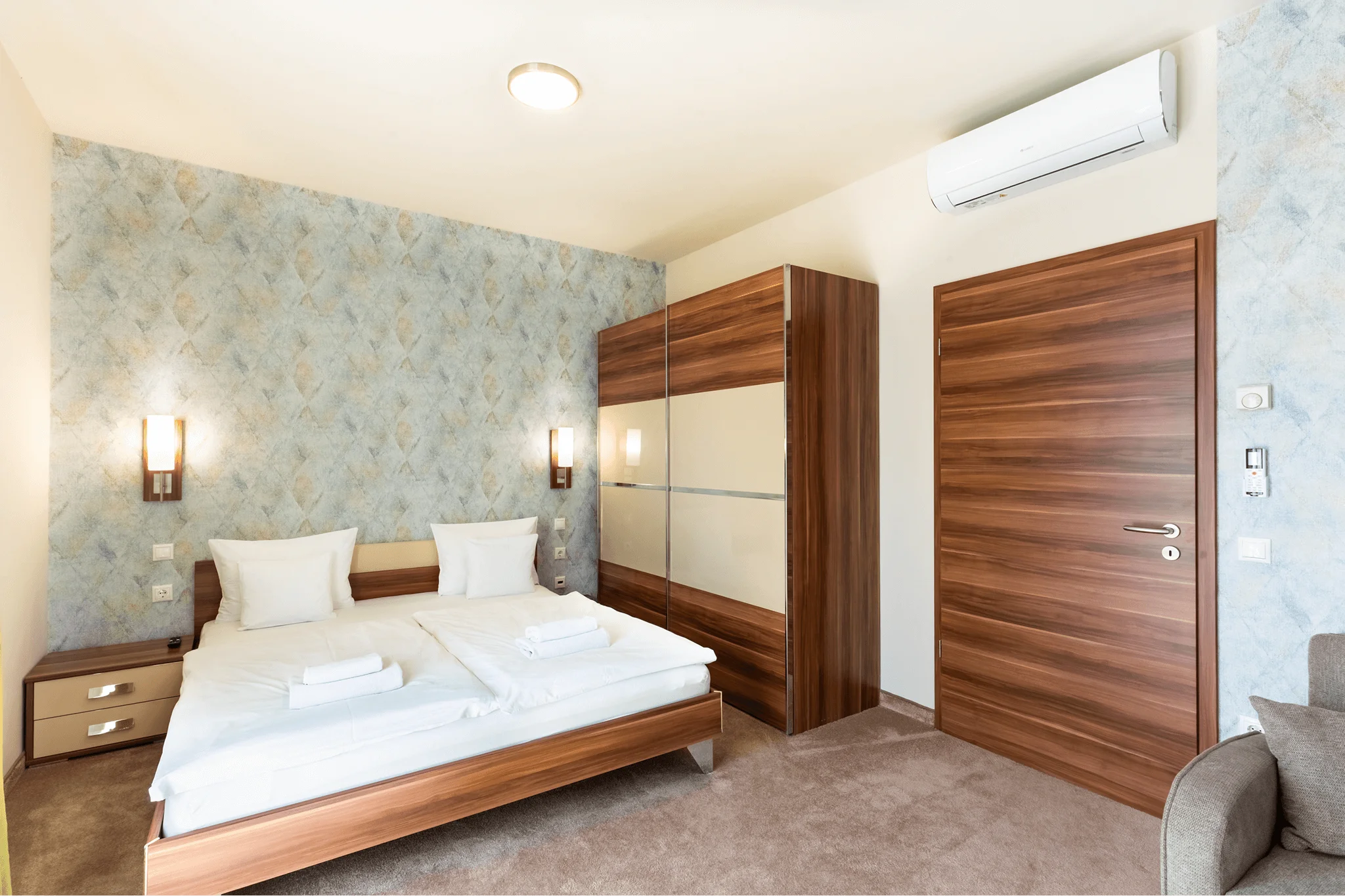 Apartments with a separate living room and bedroom. There is a double bed in the bedroom and a pull-out sofa